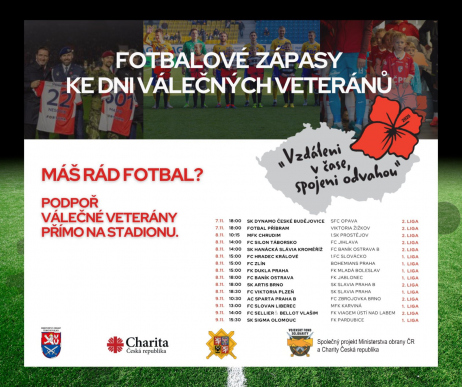 Dalším důležitým pilířem sbírky jsou ligové zápasy na podporu válečných veteránů. A právě tyto zápasy se již blíží. Projděte si jejich seznam a vyberte si, kam půjdete fandit. Pořízením vlčího máku, které pro vás budou na těchto zápasech k dispozici, se navíc zapojíte do právě běžící sbírky Vlčí mák České republiky pro válečné veterány. Fandit a podpořit, tomu říkáme dobře prožitý víkend.