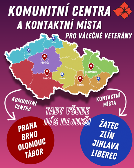 Komunitní centra pro válečné veterány jsou místa, kde jsou během otvíracích hodin přítomni kontaktní pracovníci, na které mohou klienti z řad válečných veteránů i jejich blízcí kdykoliv obrátit, ať už potřebují řešit konkrétní problémy ale i když si jen chtějí popovídat u kávy. Prostory komunitních center jsou rovněž k dispozici pro pořádání různých typů akcí, například koncertů, přednášek, setkávání spolků a mnoho dalších. Na zajímavé akce, které se v komunitních centrech konají, upozorňujeme na našich sociálních sítích.